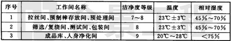 表4.1.5 光纖廠房潔凈度等級(jí)和溫度、相對(duì)濕度參數(shù)表